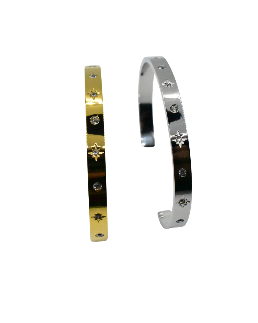 Brazalete rígido en acabado dorado satinado, decorado con pequeñas estrellas . Ariel destaca por su equilibrio entre brillo y sobriedad, evocando la belleza silenciosa de los cielos estrellados. Una joya firme, luminosa y sofisticada.