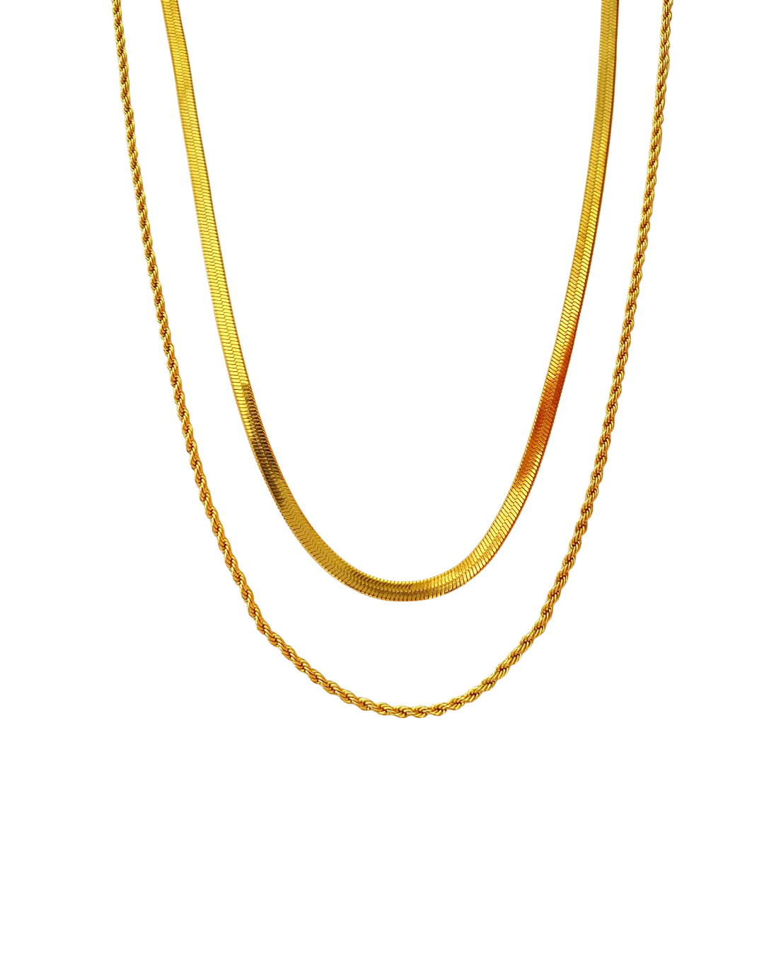 Collar doble con combinación de una cadena plana más corta y una segunda cadena con relieve en espiral.
