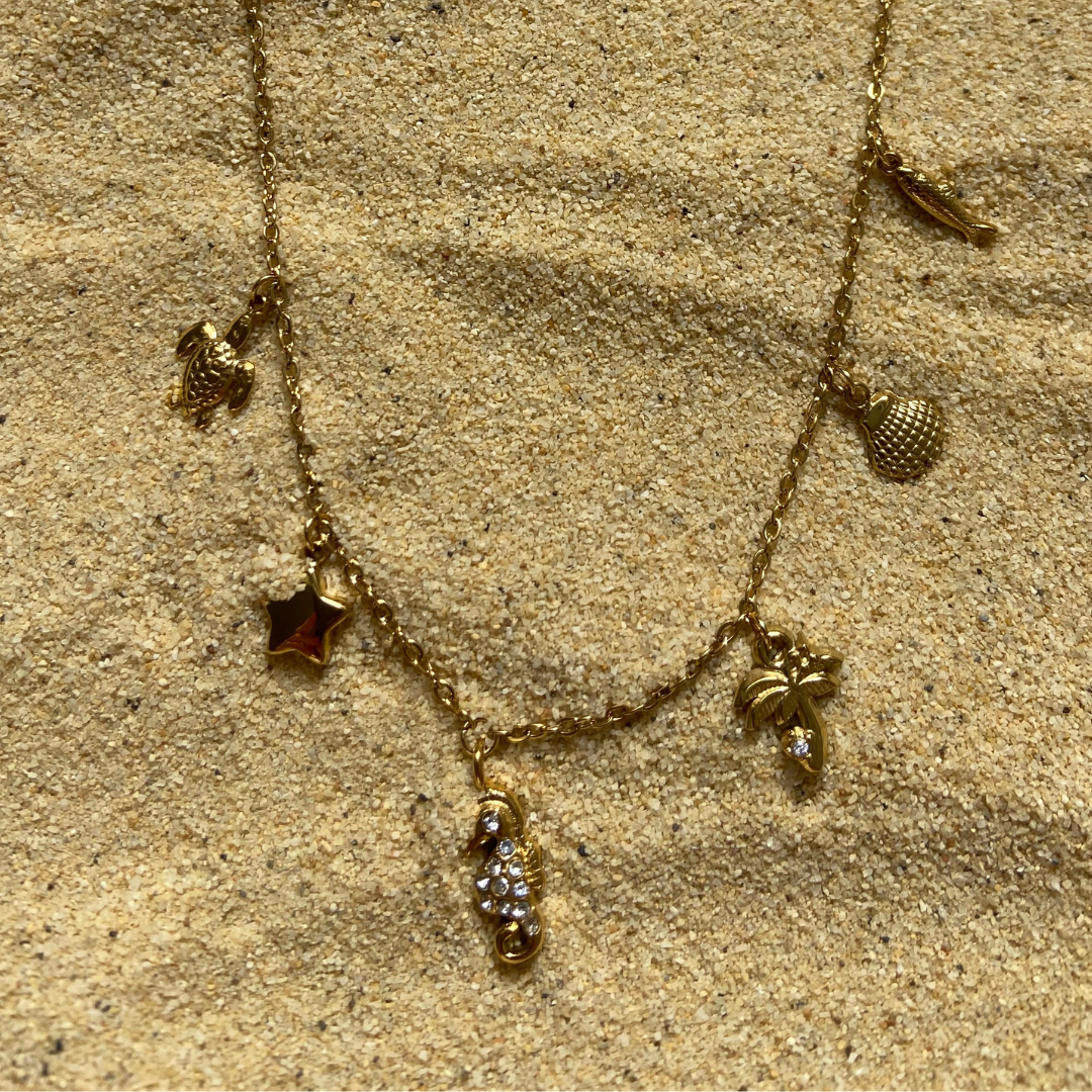 Collar compuesto por pequeños colgantes dorados en forma de elementos marinos. Elaborados en acero inoxidable y bañados en oro de 18k.