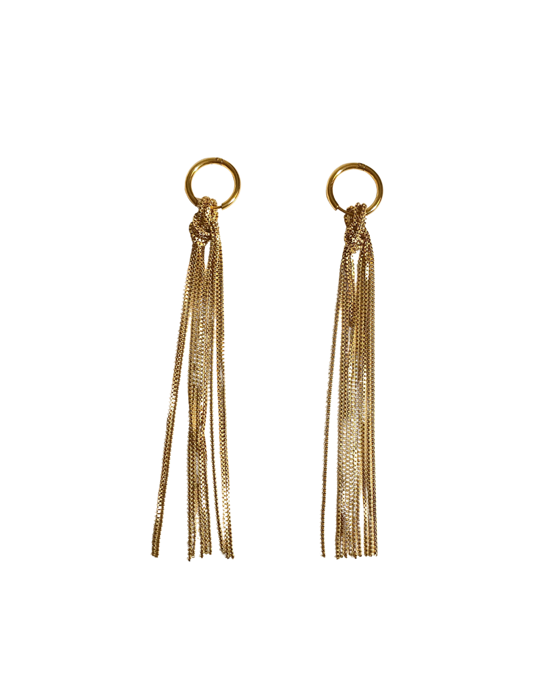 Pendientes compuestos por un pequeño aro y con diseño de cadenas fluidas. Sofisticados, ligeros y perfectos para elevar looks de noche o eventos especiales.