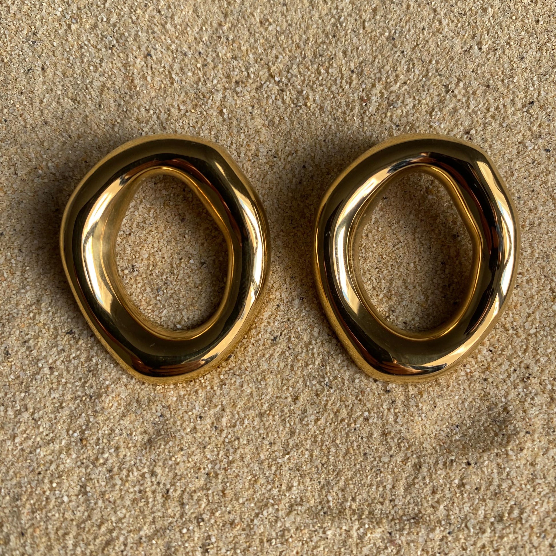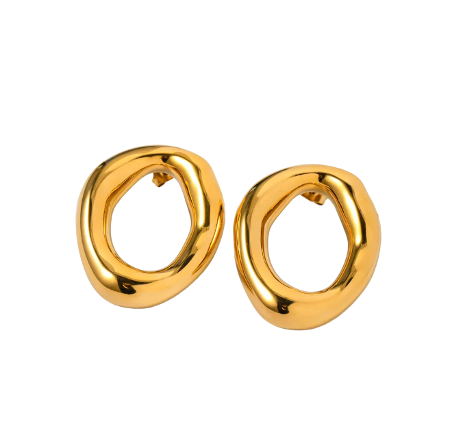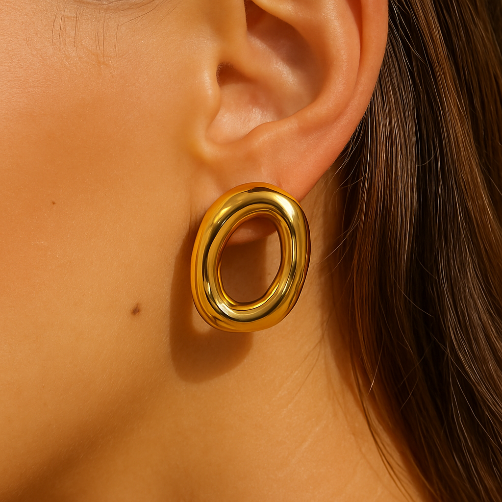 Pendientes dorados de forma ovalada y acabado pulido, fabricados en acero inoxidable y chapados en oro de 18k.