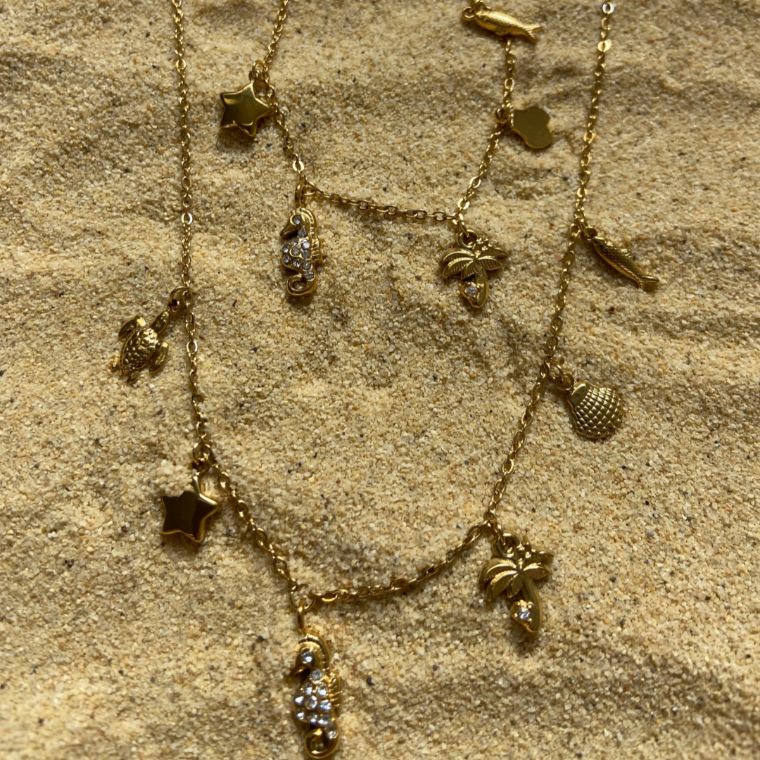 Pulsera compuesta por pequeños colgantes dorados en forma de elementos marinos. Elaborada en acero inoxidable y bañada en oro de 18k.